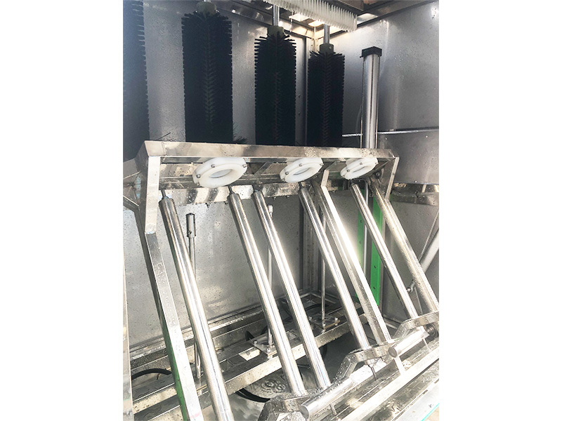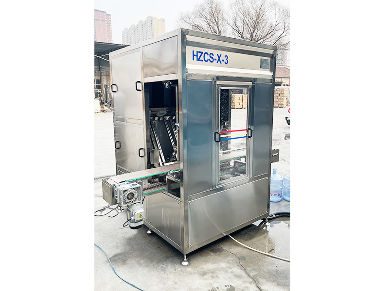 HZCS-X-3型全自动四工位高压内冲外刷机具有80-120公斤超高可调操作压力。适用于各种高难度清洗桶装水桶连线的清洁工作,超高的冲洗压力可迅速分解桶内的坚硬的污垢,可进行全方位无死角不留任何刷毛问题的洁净高效冲洗,可有效去除桶内青苔、杂质及块垢等污垢,桶外采用全方位毛刷进行刷洗,是矿泉水水厂理想清洗设备。