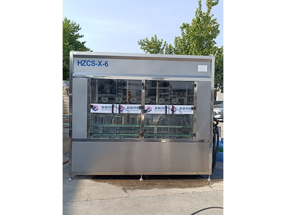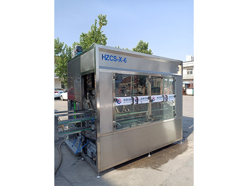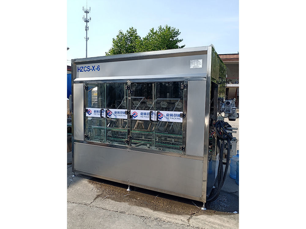 HZCS-X-6型全自动六工位高压内冲外刷机具有80-120公斤超高可调操作压力。适用于各种高难度清洗桶装水桶连线的清洁工作,超高的冲洗压力可迅速分解桶内的坚硬的污垢,可进行全方位无死角不留任何毛刷问题的洁净高效冲洗,可有效去除桶内青苔、杂质及块垢等污垢,桶外采用全方位毛刷进行刷洗,是矿泉水水厂理想清洗设备。