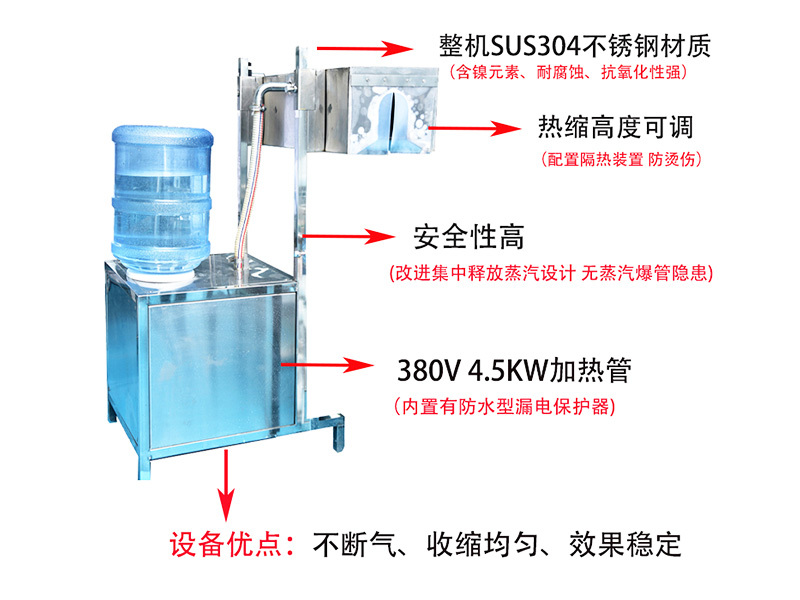 该机适用于对5加仑大桶饮用水生产过程中瓶口包装膜的热缩,并设有成品输送系统减速电机控制。本机采用蒸汽式热缩膜方式,可以使瓶口周围温度均匀,包装膜热缩效果良好,热缩高度可调,配置隔热装置,防烫伤,改进集中释放蒸汽设计,无蒸汽爆管隐患,不断气,收缩均匀,效果稳定,常压快速加热产生蒸汽,节能安全无故障。