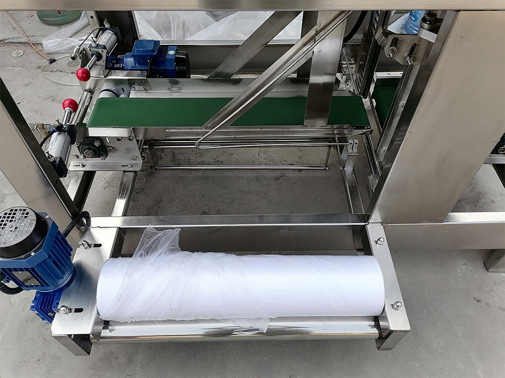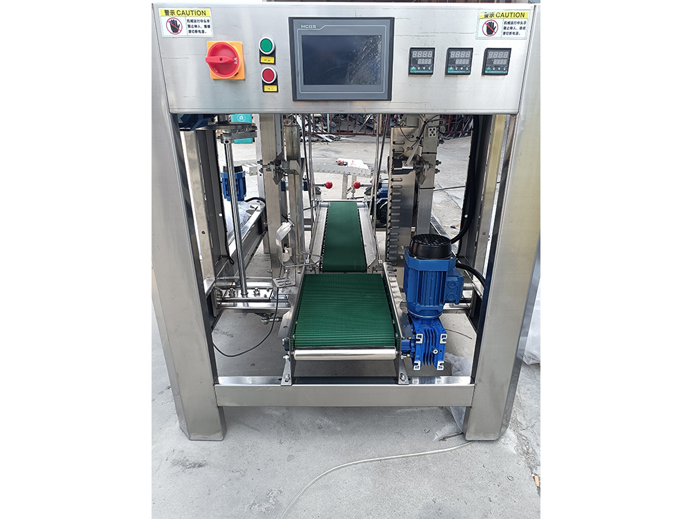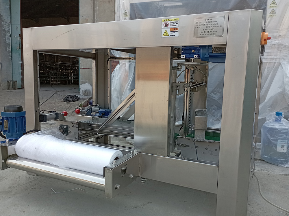 全自动套袋机是本公司自主研发生产的桶装水生长线全自动包装设备之一。是为桶装成品水外包装PE保护膜的专业设备,整体设备采用不锈钢机架与封板,立体设计美观大方,采用PLC自动控制,触摸屏显示各项操作功能及操作提示;夹具与封切采用可调控设计,三相变频电机带动定位更准确平稳可靠,噪音小;温度控制仪可任意设定调控封头温度;具有紧急停止功能,按下急停按钮机器立刻停止。整体操作可实现人机对话,操作简单方便。