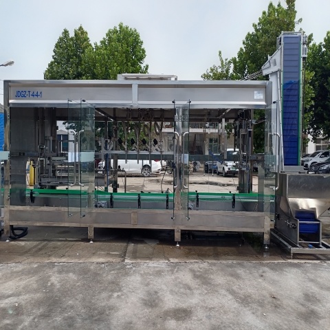 当清洗完的空瓶子由输送系统送到灌洗系统后,底部顶桶气缸动作,把瓶子侧移,使瓶子底部与输送带离开,进行灌装,通过程序设定达到一定时间后(灌满后)(容积可任意调节)停止灌装,顶桶气缸做推出运动,使装满水的瓶子放到输送节上,然后输向封盖系统。