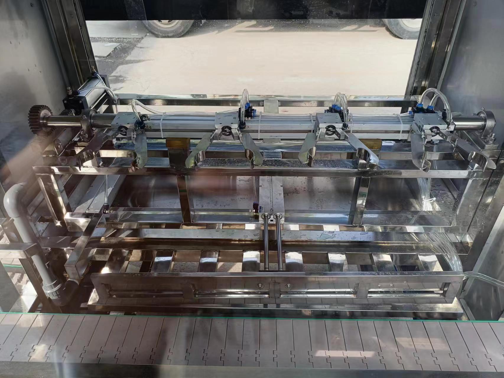 一次性桶反冲系统与空瓶输送架相连,当空瓶进入反冲系统范围内通过光电感应,由电路控制系统指令气路电磁阀动作,推入冲洗工位,使夹瓶气缸把瓶口夹紧,然后由翻瓶气缸动作,使瓶口向下进行冲洗。