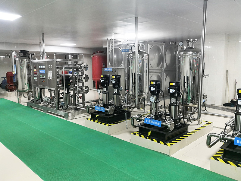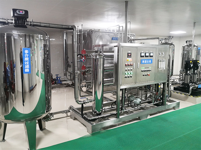 纳滤装置是将自然水源为原水,经过原水泵加压后通过混凝砂滤、活性炭滤、离子交换树脂软化或阻垢加药系统及精密保安过滤等工序,再通过高压泵加压,利用纳滤膜的筛分效应与荷电效应,对高价离子脱除率较高,对于低价离子的脱除率随膜品种的不同而具有很大差异。可保留水中原有的微量矿物质。