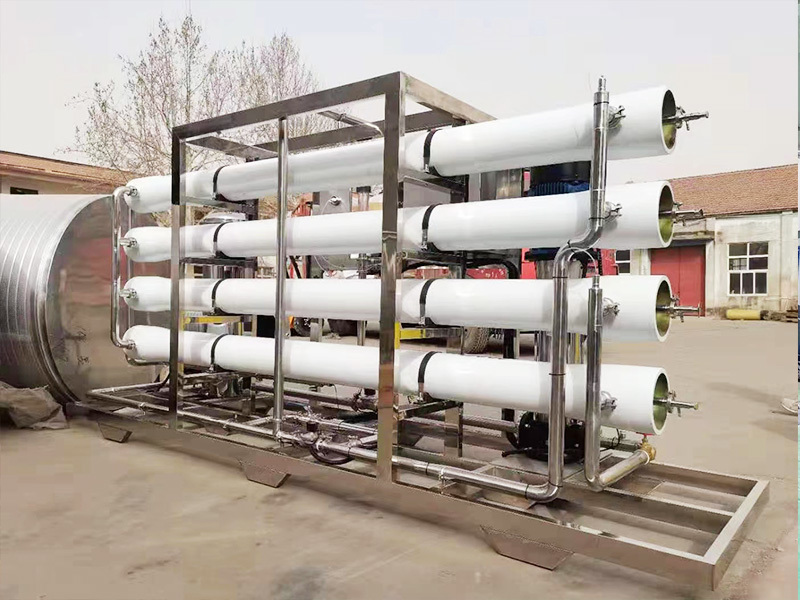 反渗透装置是将自然水源为原水,经过原水泵加压后通过混凝砂滤、活性炭滤、离子交换树脂软化或阻垢加药系统及精密保安过滤等工序,再通过高压泵加压,经过反渗透膜,利用孔径相当于0.5nm的反渗透膜,使较高浓度的水变为低浓度水,同时将工业污染物、重金属、细菌、病毒等大量混入水中的杂质全部隔离,从而达到饮用规定的理化指标及卫生标准,还可以配置不同工艺,满足不同需求。